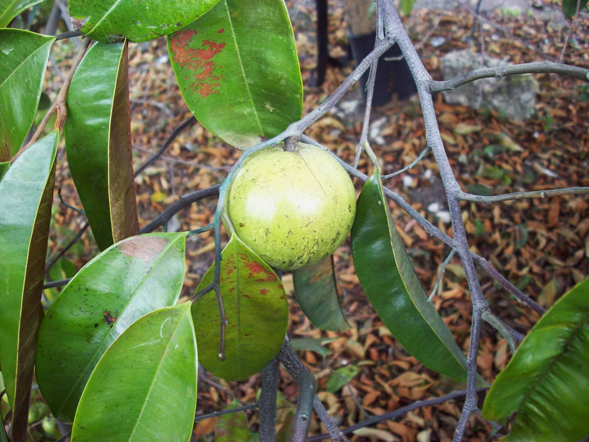 Leaves are glossy on top and often covered with a golden felt beneath. Small white flowers appear in clusters and develop into round fruits with a soft, sweet pulp when ripe. The tree is native to the Caribbean and parts of Central and northern South America and has a dense, evergreen crown.