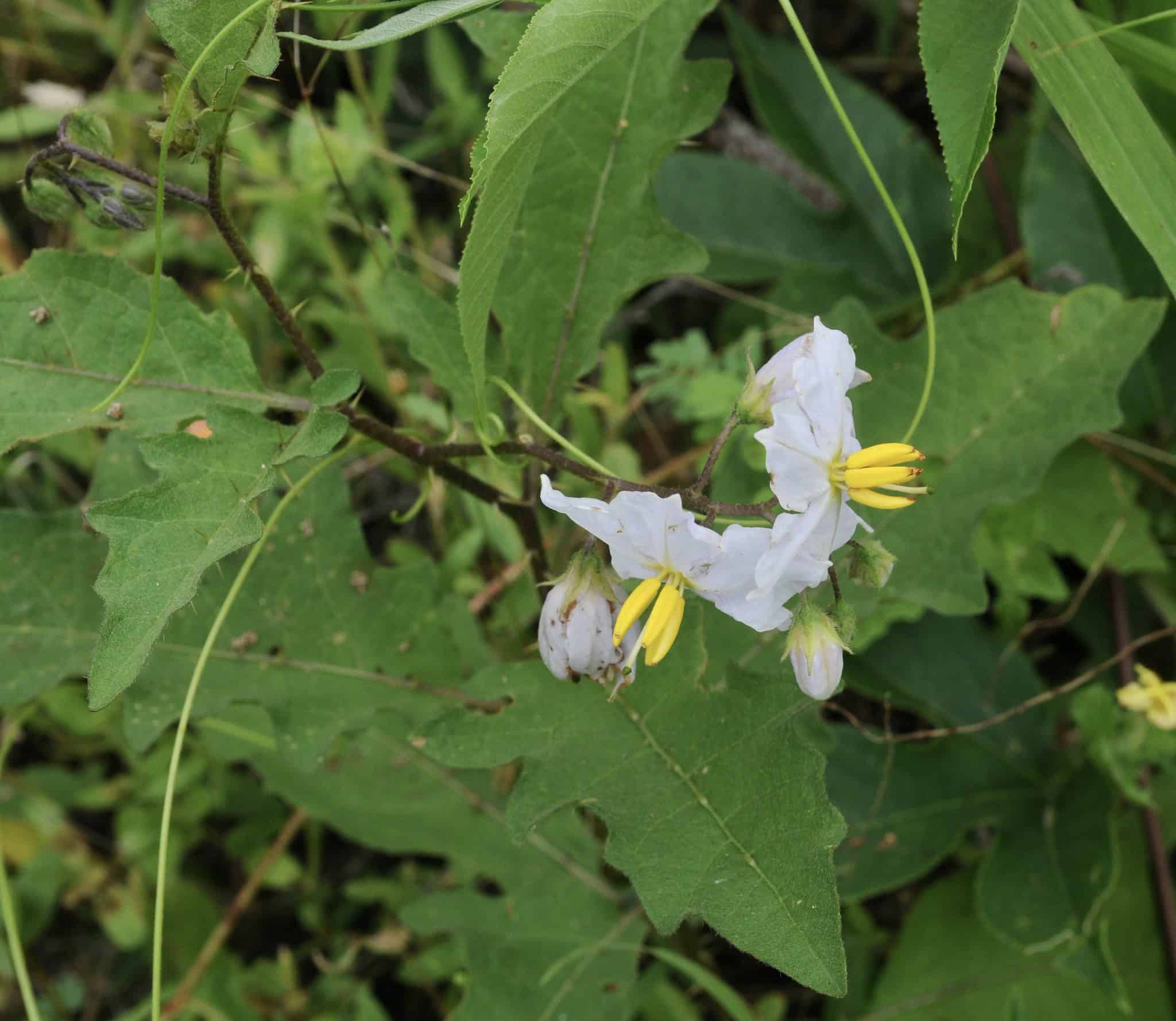 Horsenettle has branching stems and leaves with sharp spines. Flowers are star shaped and white to pale purple with yellow centers. Fruits are small yellow to orange berries. Mature plants typically stand about 1 to 3 feet tall.