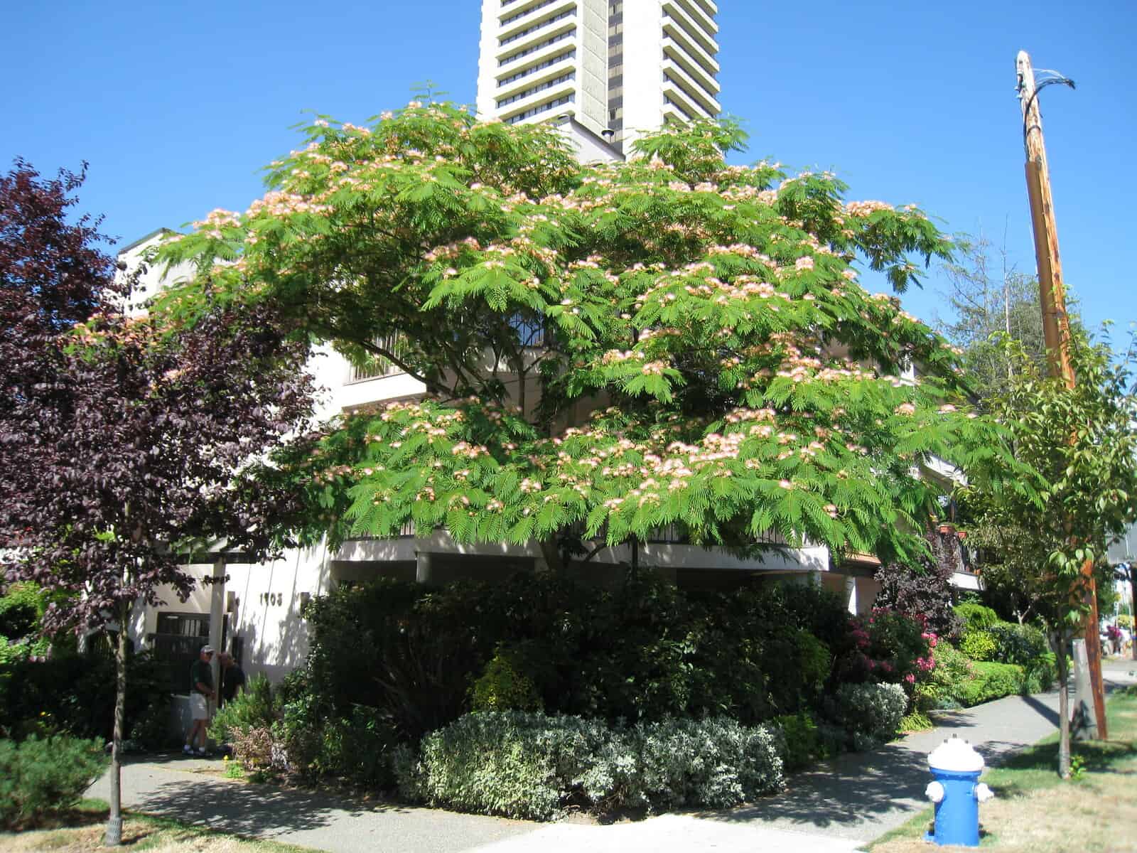 Albizia julibrissin is a broadly spreading deciduous tree with fine, fernlike leaves and showy pink, powder puff flowers in summer. In cultivation it typically reaches about 20 to 40 feet tall and commonly spreads 20 to 35 feet wide.