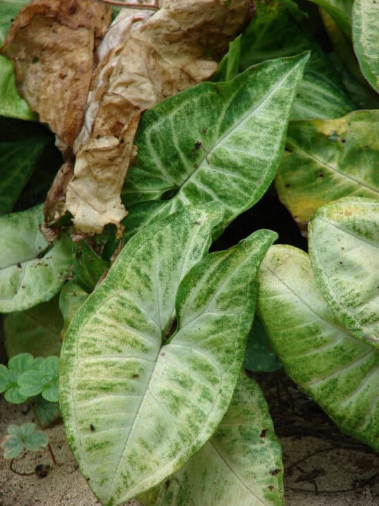 Variegated Arrowhead Vine is a tropical aroid grown for its decorative arrowhead leaves and white or cream variegation. Often kept as a trailing or climbing houseplant.